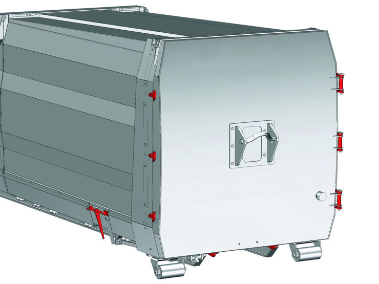 Die Hecktür bzw. Heckklappe der PÖTTINGER Presscontainer ist serienmäßig mit einer 8-Punkt-Verriegelung ausgestattet und gewährleistet hohe Flüssigkeitsdichtheit. Der integrierte Transporthaken ermöglicht ein sicheres Aufziehen auf den LKW. Für maximale Sicherheit sorgen die Sicherheitsentriegelung sowie die Türfangsicherung. Bei geänderten Anforderungen kann die Rückwand dank modularer Konstruktion einfach und ohne aufwendige Umbauten von Tür auf Klappe umgerüstet werden.